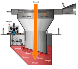 EHS inerting systems address the hazards of solids addition to process vessels through open ports and manways. The Nitrogen Purge Hopper maintains a low oxygen concentration during the vessel charging process using two key features: a pneumatically powered valve that limits the amount of time the vessel is exposed to ambient air and a full perimeter annular ring that dilutes any incoming ambient air by injecting nitrogen into the product stream.
