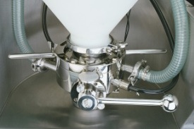 Each ChargeBottle is profiled with the optimal cone shape to ensure good flow. Utilising a translucent polypropylene ChargeBottle allows for visual confirmation of complete product charge. When handling difficult products, additional means can be provided either with a Vibratory collar or by utilising a pressure rated ChargeBottle with flushing capability.